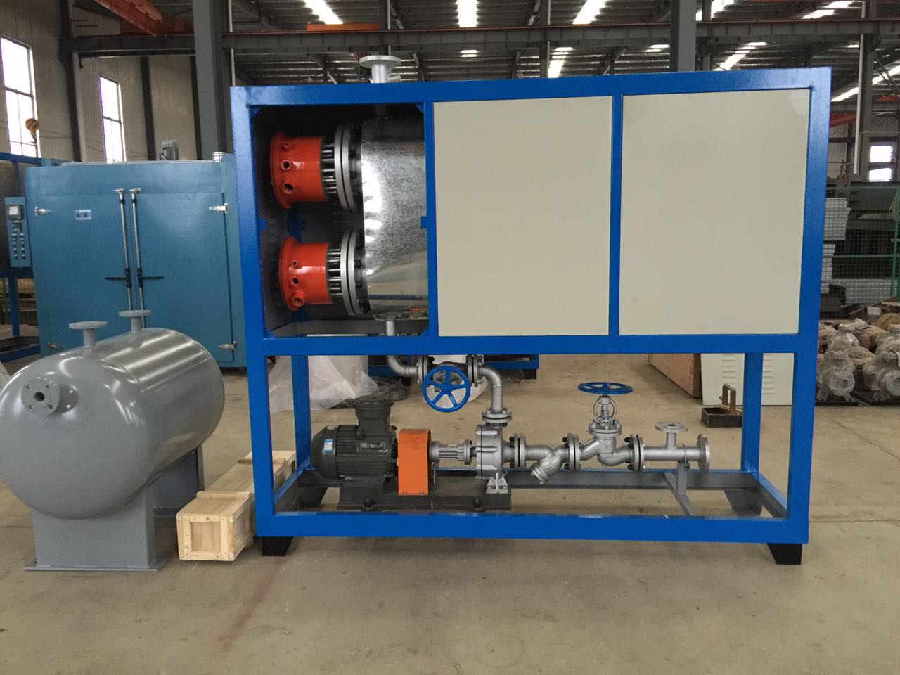 導(dǎo)熱油爐排氣流程: 1、導(dǎo)熱油通過膨脹槽注油口處加注,并通過膨脹口管道流入設(shè)備及油爐本體內(nèi),此時注油時一定要打開系統(tǒng)中所有的閥門(放油閥除外),讓導(dǎo)熱油流入筒體及需加熱設(shè)備內(nèi)。 2、當(dāng)液面顯示約為膨脹槽高度1/2時,停止注油。 3、首 行常溫排氣:接通電源,打開導(dǎo)熱油加熱器的進(jìn)出口閥門及排氣閥(膨脹管道閥門需一直開著以及時補(bǔ)充油量),按動油泵啟動按鈕,油泵運(yùn)行,油泵應(yīng)按箭頭指示方向正常運(yùn)行,壓力表壓力顯示在規(guī)定范圍內(nèi),視聽油泵運(yùn)行情況,如有異常現(xiàn)象應(yīng)立即停機(jī)檢查,將故障排除后再重新起動油泵,進(jìn)行常溫下排氣,直至壓力表指示穩(wěn)定。進(jìn)行常溫排氣時,要注意觀察膨脹槽內(nèi)的液位,當(dāng)?shù)陀谝?guī)定的液位高度時要及時進(jìn)行補(bǔ)充。 4、升溫脫水:在確認(rèn)常溫下運(yùn)行正常后,即可進(jìn)行升溫脫水排氣(操作前詳閱導(dǎo)熱油使用說明書及溫控儀使用說明書),升溫脫水排氣可按如下步驟進(jìn)行: 步:升溫至100-120℃保溫 開始升溫時,應(yīng)該控制升溫速度在50℃/h以內(nèi),并且監(jiān)視壓力表顯示是否正常,如發(fā)現(xiàn)無壓力或壓力不穩(wěn),說明系統(tǒng)內(nèi)仍有殘留氣體,此時要求按3要求重復(fù)進(jìn)行常溫排氣操作,待系統(tǒng)壓力穩(wěn)定后方可繼續(xù),升溫至120℃后進(jìn)行長時間保溫,保溫時間的長短與系統(tǒng)總?cè)萘考皩?dǎo)熱油的質(zhì)量有關(guān)。  第二步:升溫至150-180℃保溫。  排除油中輕組分、揮發(fā)物及殘余水分,請參照KRD系列導(dǎo)熱油加熱器系統(tǒng)脫水排氣曲線圖操作 第三步:脫水排氣完成后要關(guān)閉排氣閥(其它閥門無需關(guān)閉),投入正常升溫運(yùn)行。 5、 升溫脫水排氣過程有關(guān)事項(xiàng)。 升溫過程中管路可能會發(fā)出碰擊的響聲,說明系統(tǒng)內(nèi)有大量氣體或管道不暢,此時要降低升溫速度,待氣體排除便可消除聲響;如系管道不暢所至應(yīng)予以排除。 脫水排氣過程可能會有大量氣體涌入膨脹槽,造成槽內(nèi)導(dǎo)熱油外溢,操作前要在溢油管下安置好溢油容器。 進(jìn)行脫水排氣時,現(xiàn)場必須有人員看守,發(fā)現(xiàn)異常及時處理。   對于所提的油泵無油或少許油流出的問題,解決方案如下: 1、 關(guān)閉出油口閥門,啟動油泵,觀察壓力表顯示情況,若無壓力,則說明回油口無油補(bǔ)充油泵,使得油泵空轉(zhuǎn),無后續(xù)油及時補(bǔ)充,則請貴司檢查一下回油口的供油情況,此時請確保膨脹槽里有油并膨脹管道閥門打開和需熱設(shè)備有油并出油口閥門在打開狀態(tài)。 2、 如果以上要求都執(zhí)行到位,壓力表還無壓力,請檢查油爐上的油泵、截止閥及過濾器是否堵塞。 3、 若壓力表顯示壓力值,而油泵、截止閥及過濾器并無堵塞,那油爐的出油口一定會按油泵所提供的流量進(jìn)行流出。